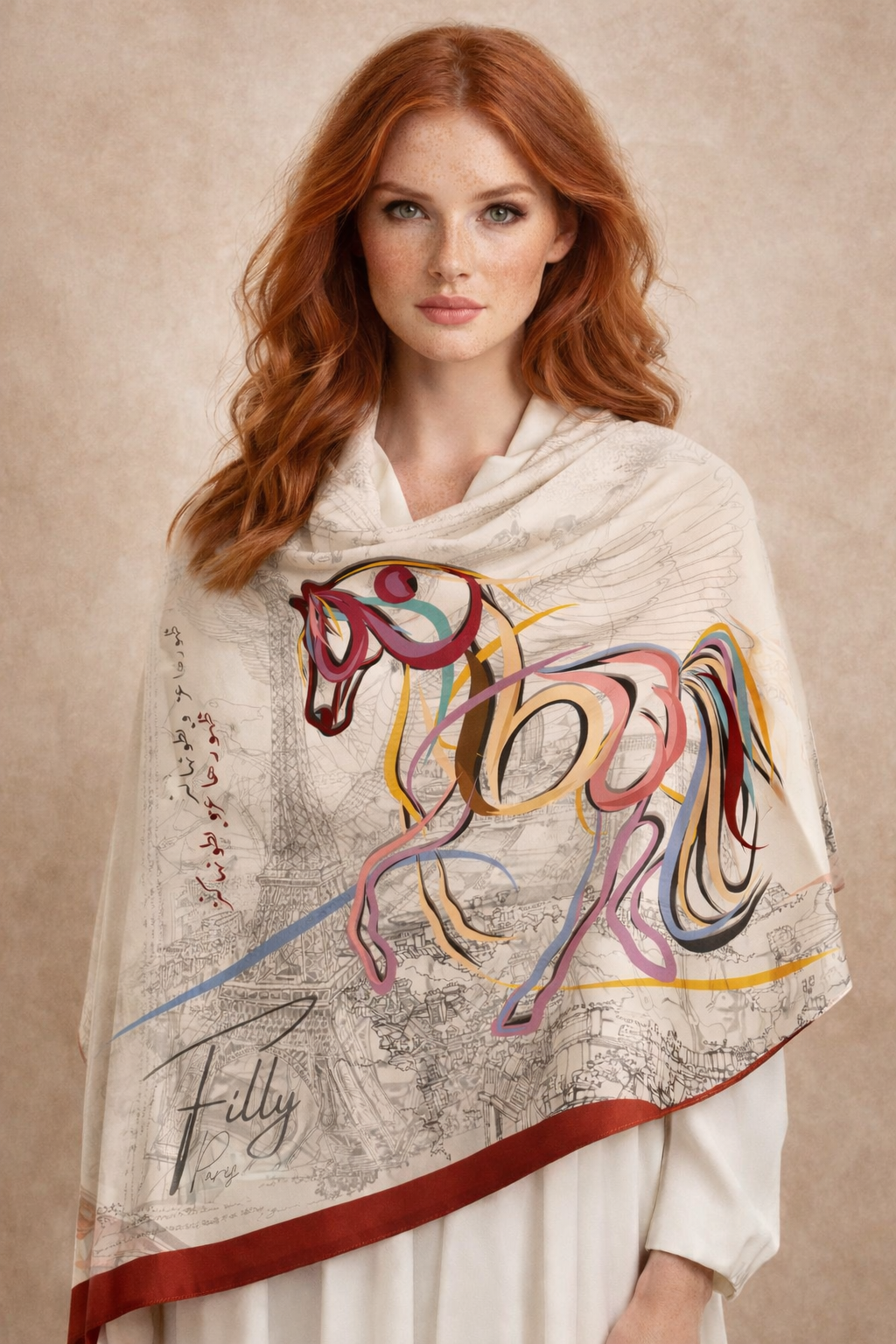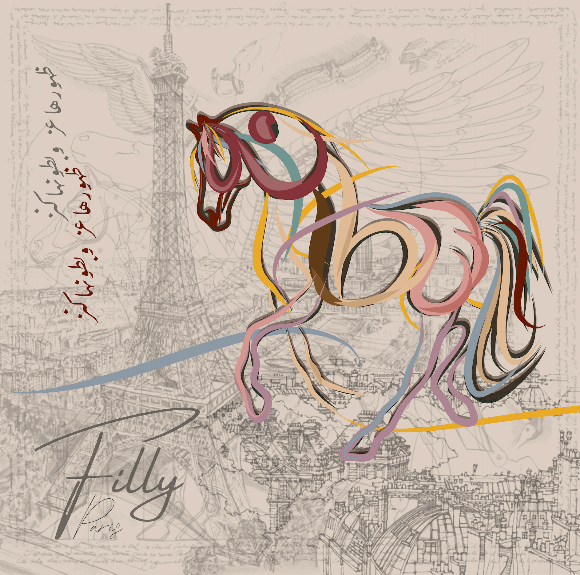 The design showcases a calligraphic map of Paris, tracing areas around the Eiffel Tower and the monument itself, interwoven with flowing Arabic calligraphy. This dialogue of scripts reflects the union of French elegance and Arabian heritage. Filly’s signature monogram and abstract equestrian motifs complete the composition.