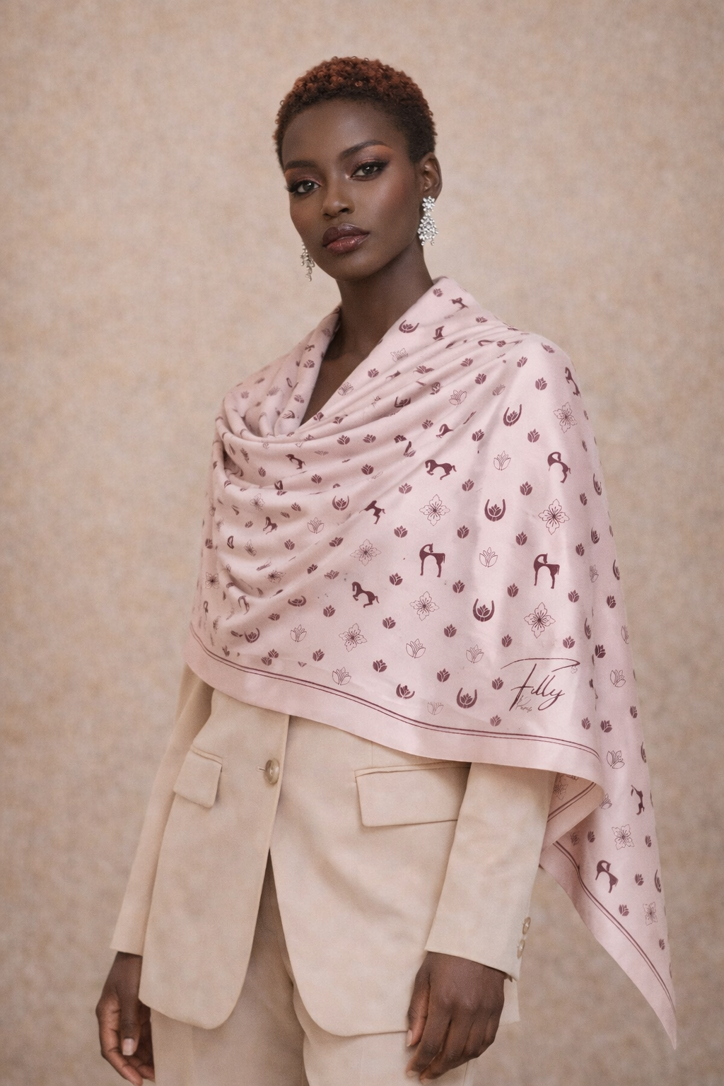 The design is composed entirely of Filly signature monograms, arranged in a refined, rhythmic composition that celebrates the identity of the House. Minimal yet expressive, this timeless pattern elevates the purity of the silk and the delicacy of the color.